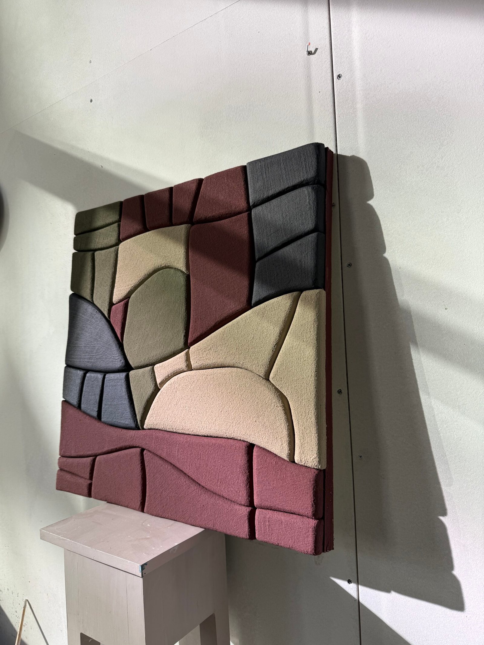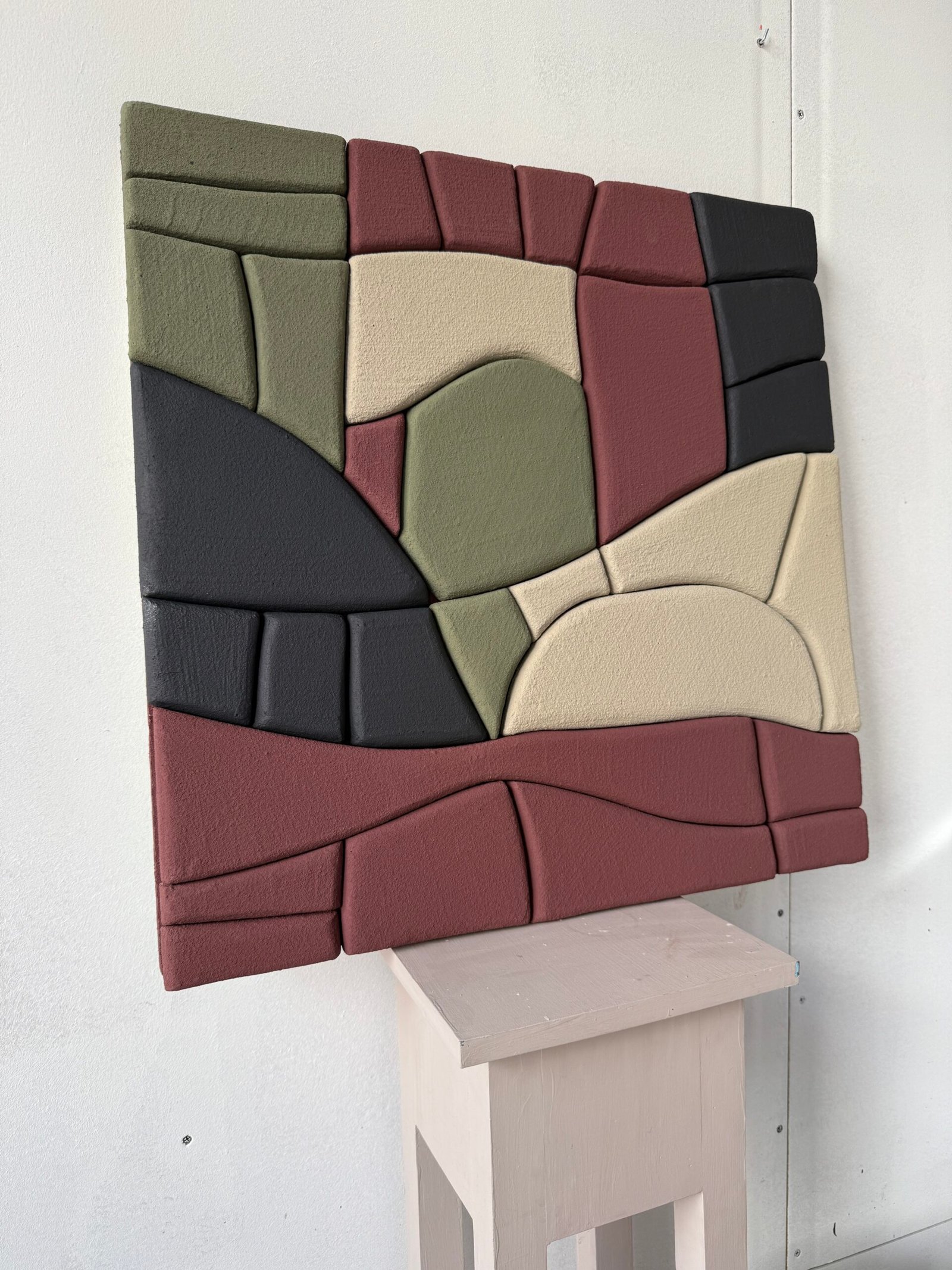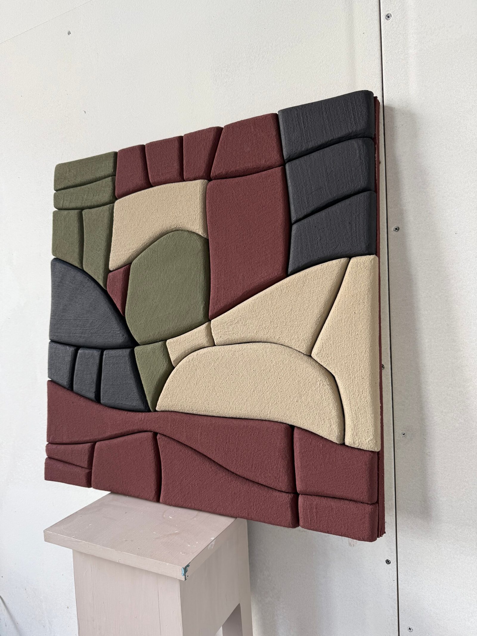 Each piece is handcrafted using upcycled polystyrene (construction waste) and coated with water-based natural marble plaster. This technique creates rich texture, depth, and dimension — while prioritizing both safety and sustainability.