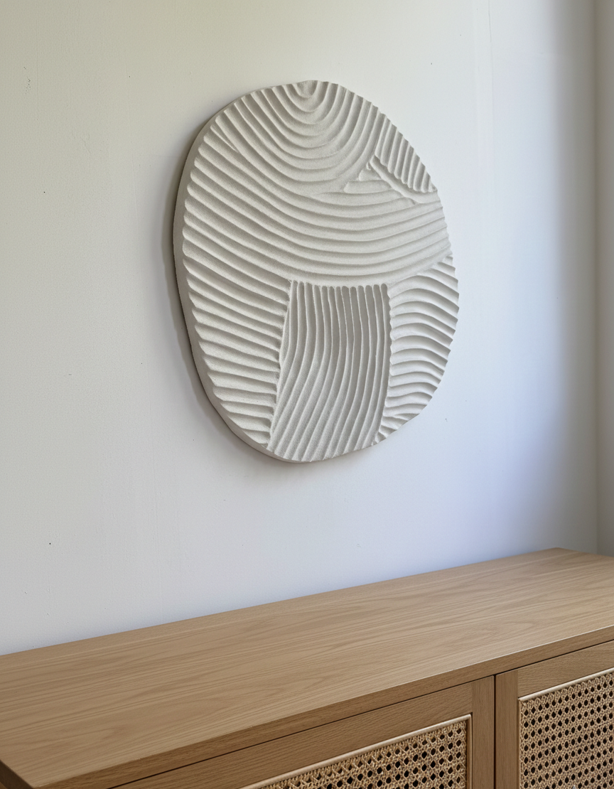 Each piece is handcrafted using upcycled polystyrene (construction waste) and coated with water-based natural marble plaster. This technique creates rich texture, depth, and dimension — while prioritizing both safety and sustainability.