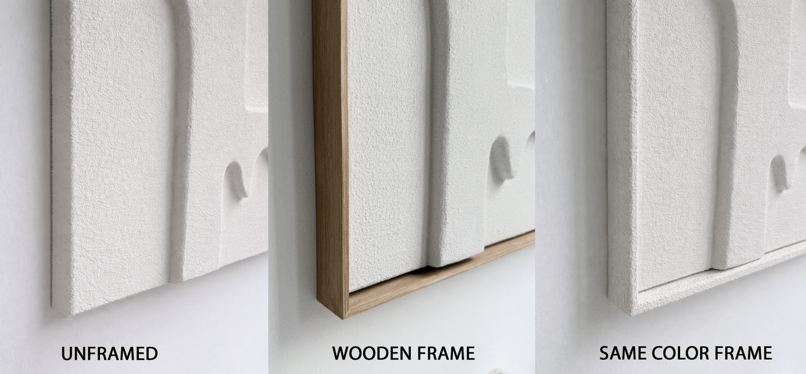 Almost all artworks are available in both framed and unframed options. You can choose between two frame styles: natural oiled wood or wood painted in the same color as the artwork.